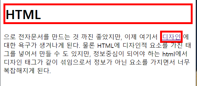 <h1>HTML</h1>으로 전자문서를 만드는 것 까진 좋았지만, 이제 여기서 <a href="https://hanachoi-coding.tistory.com/manage/newpost/11?type=post&returnURL=https%3A%2F%2Fhanachoi-coding.tistory.com%2F11">디자인</a>에 대한 욕구가 생겨나게 된다.