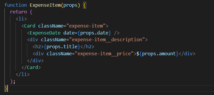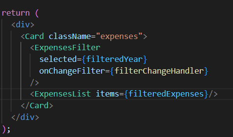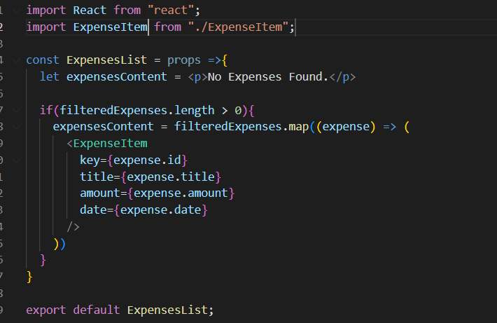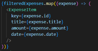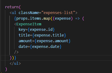 - <ExpensesList>파일에서 <ul>태그를 만들어서 <ExpenseItem>을 maping 했던 부분을 JSX로 불러와준다.