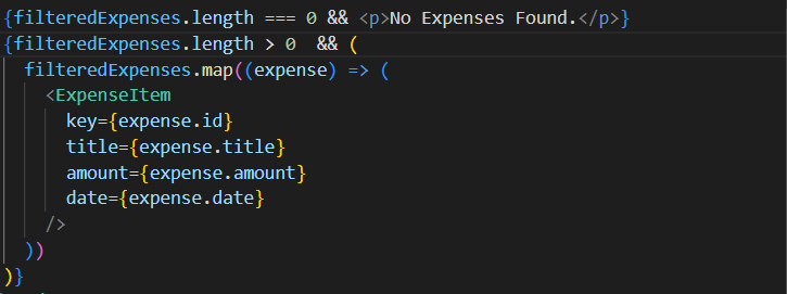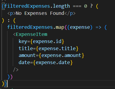 - 대신 삼항 또는 조건부 표현식을 사용해서 filteredExpenses.length가 0인지 알아볼 수 있다. length가 0이라는 소리는 어떤 데이터도 안에 들어있지 않다는 뜻!