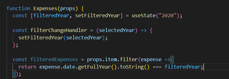 - 일치하는 연도의 date를 체크하기 위해 expense.date를 불러준다. 위의 Expenses 함수에서 state를 설정해준 filteredYear는 문자열로 설정되어 있고 우리의 date는 날짜 객체로 정해져 있다.