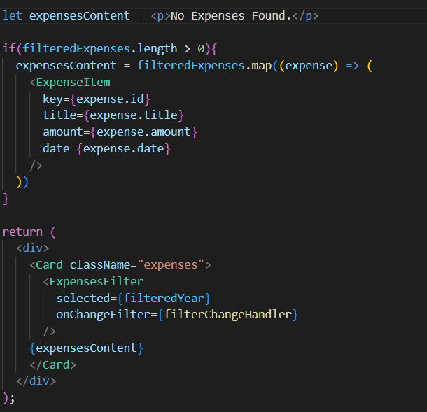 - 그리고 return 부분에는 JSX 문법으로 {expensesContent } 넣어주면 코드가 실행된다.